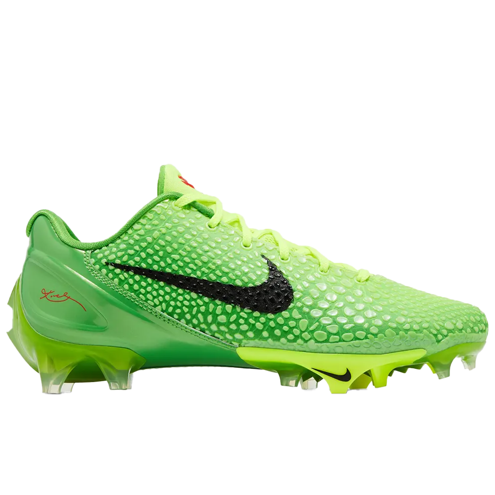 Nike Vapor Edge Kobe 6 SE Grinch to wyjątkowa fuzja legendy koszykówki i nowoczesnej technologii footballowej, która łączy kultowy design z doskonałymi osiągami na boisku. Inspirowane jedną z najbardziej rozpoznawalnych kolorystyk w historii sneakersów, buty wyróżniają się jaskrawą, neonowo-zieloną cholewką, przypominającą skórę węża, co nawiązuje do oryginalnego modelu Kobe 6 Grinch.